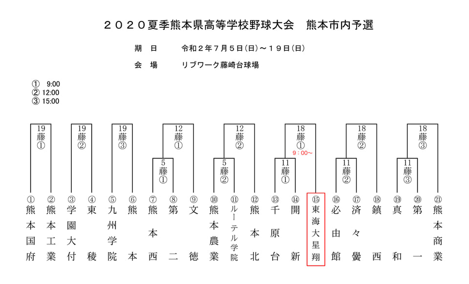 初戦は7月18日第1試合9:00からリブワーク藤崎台球場にて、千原台高校 対 開新高校の勝者との戦いになります。勝てば決勝トーナメント進出が決まります。